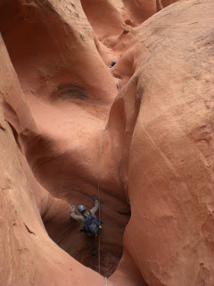 With a short hike to the head of Monkey Business, Double-A and I dropped in and soon encountered twisty narrows that challenged our already-fatigued bodies. Pulling our packs through tights slots, as is always the case, proved tiresome and tedious. But the slot was wonderful!